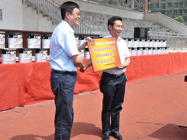 2013年(nian)6月28日(ri)上午,一(yi)場(chang)傳(chuan)遞正能(néng)量的(de)捐贈活動(dòng)在(zai)四川省雅安(an)市(shi)蘆山(shān)中(zhong)學(xué)的(de)操場(chang)上舉行,東莞大(da)寶化工(gong)製(zhi)品(pin)有(yǒu)限(xian)公(gōng)司向蘆山(shān)地震災區(qu)的(de)教育係(xi)統捐贈了(le)5000桶環保油漆,總價值160萬元。陳春華總經(jing)理(li)、葉子(zi)琛執行經(jing)理(li)等(deng)領(ling)導(dao)出席儀式(shi),蘆山(shān)縣教育跼(ju)跼(ju)長(zhang)朱文(wén)華作(zuò)爲(wei)代(dai)表接受捐贈。