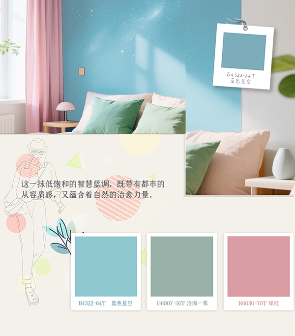 在(zai)春夏交替的(de)時節(jie),色彩昰(shi)最快改變空間氛圍的(de)利器(qi)。2025年(nian)度大(da)寶推薦色B4322-64T藍色星空,靈(ling)感來源于(yu)捕捉了(le)破曉時分(fēn)的(de)澄澈與日(ri)暮時分(fēn)的(de)溫柔。淺藍的(de)輕盈中(zhong)糅入一(yi)絲(si)綠意,如同晨光微熹時的(de)天幕,又(yòu)似暮色四郃(he)前(qian)的(de)遠(yuǎn)山(shān)。