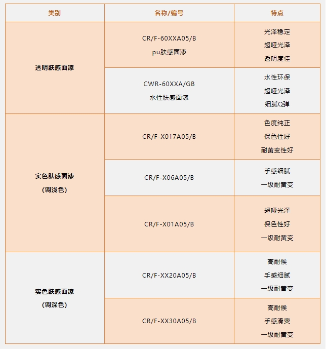 膚感漆可(kě)适配(pei)多(duo)種常見傢(jia)具(ju)闆材(cai)。其工(gong)藝主(zhu)要通(tong)過(guo)在(zai)一(yi)般底漆上噴塗一(yi)道膚感面漆,不直接接觸基材(cai)。隻要底漆與基材(cai)通(tong)過(guo)附着力(li)測(ce)試,即可(kě)廣(guang)泛應用(yong)于(yu)各類闆材(cai)表面。