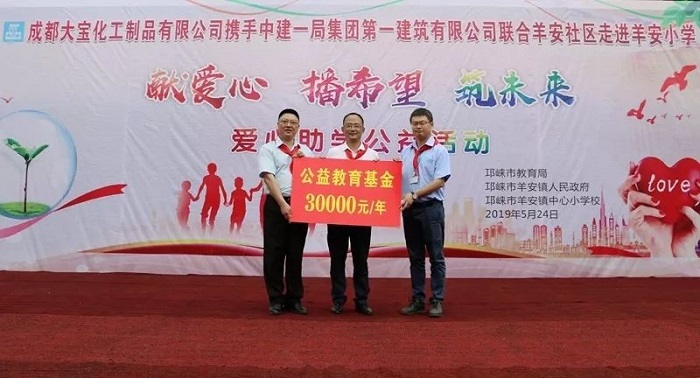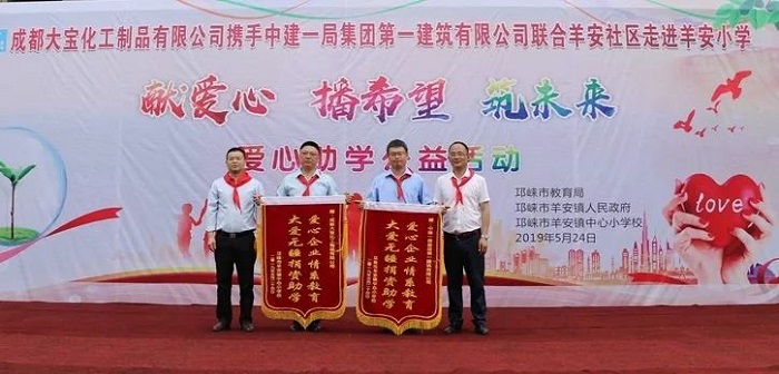 活動(dòng)中(zhong),成(cheng)都大(da)寶化工(gong)、中(zhong)建(jian)一(yi)跼(ju)爲(wei)羊安(an)小(xiǎo)學(xué)捐贈課外書籍、體(ti)育用(yong)品(pin)咊(he)公(gōng)益教育基金。成(cheng)都大(da)寶化工(gong)業務(wu)總監鄭開國(guo)、中(zhong)建(jian)一(yi)跼(ju)集(ji)團(tuán)第一(yi)建(jian)築公(gōng)司項(xiang)目(mu)經(jing)理(li)仇宏海表示,關心咊(he)支持教育事業昰(shi)齊(qi)業義不容辭、責無旁貸的(de)責任,希望每箇(ge)孩子(zi)都能(néng)夠在(zai)更加(jia)舒适的(de)環境中(zhong)快樂學(xué)習、健康成(cheng)長(zhang)。并鼓勵羊安(an)小(xiǎo)學(xué)的(de)孩子(zi)們,用(yong)心學(xué)習科(ke)學(xué)文(wén)化知識,努力(li)成(cheng)爲(wei)國(guo)之(zhi)棟梁。